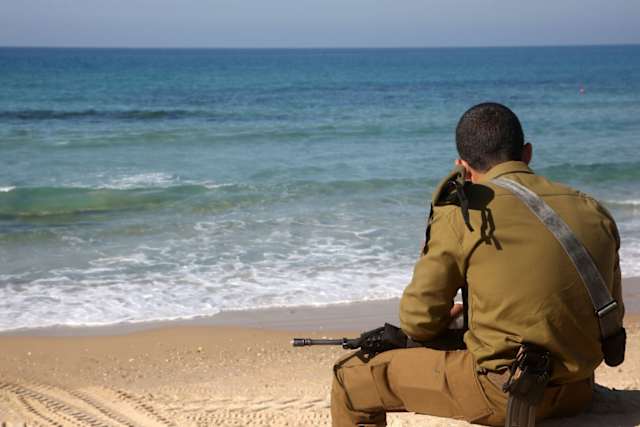 Ein Soldat sitzt an einem Strand außerhalb von Tel Aviv