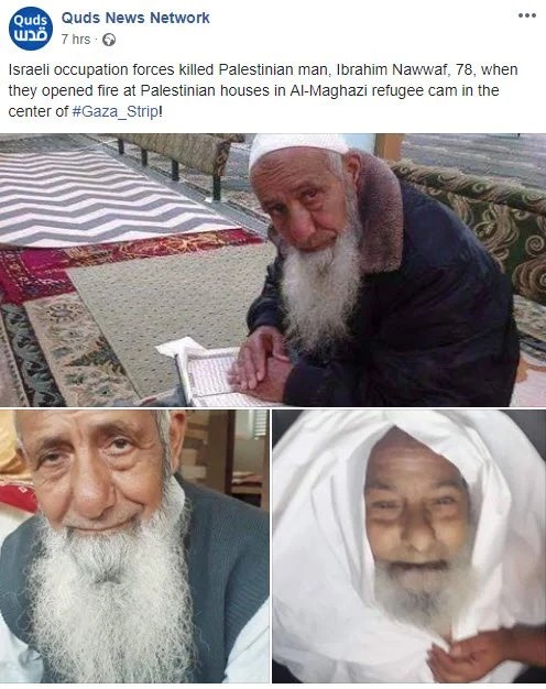 Quds News Network bejammert diese „Tötung“ ebenfalls. Außer dass er nach ihren Angaben jemand anderes war – der 78-jährige Ibrahim Nawwaf.